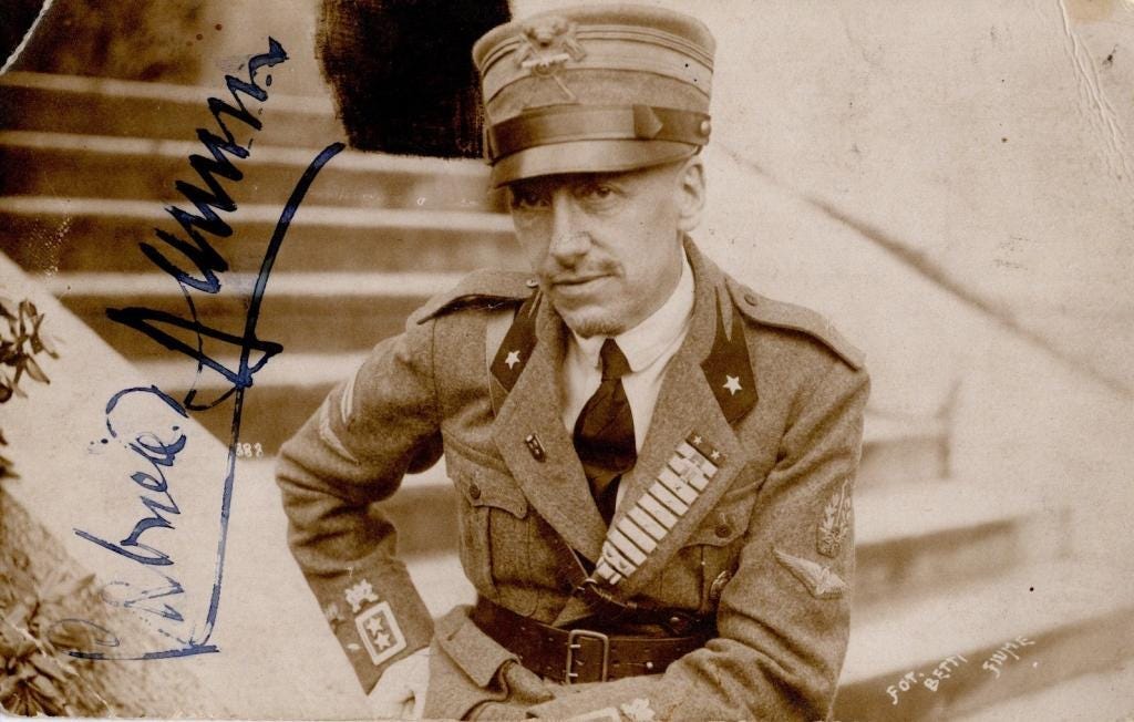 But D’Annunzio was not an attractive man. By all accounts he was scrawny and bald, and one French actress described him as “the only man I have ever seen with teeth of three colors: white, yellow, and black.” At first, this detail about his appearance might seem irrelevant, but it is in fact crucial for understanding the enormity of what he accomplished.